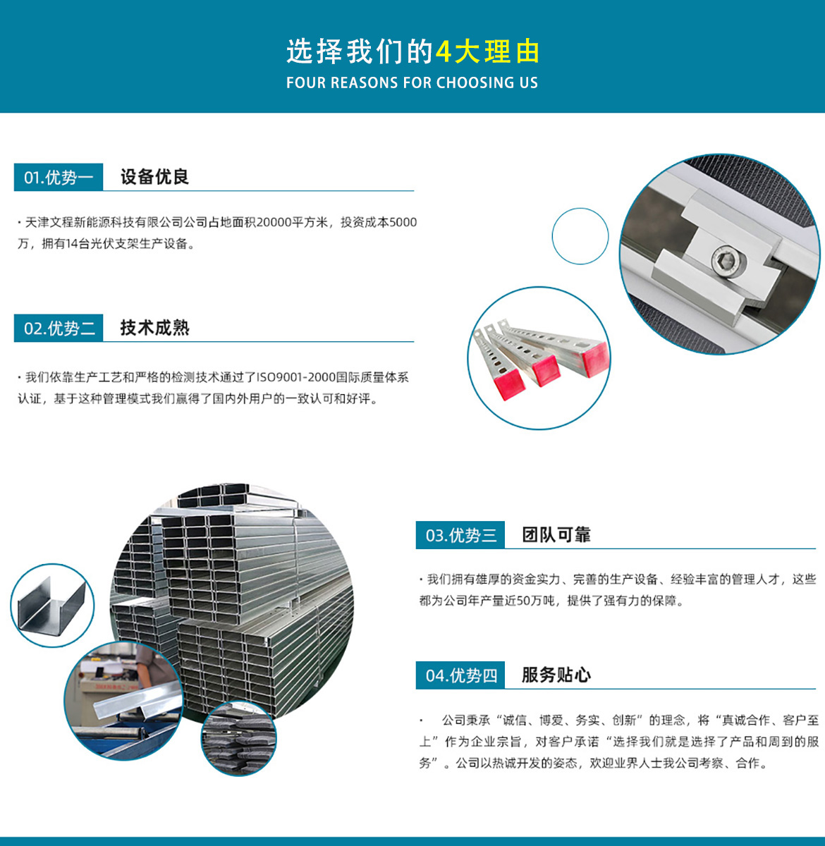 關(guān)于我們天津文程新能源科技有限公司成立于2021年,是專注于集中式、分布式、漁光互補(bǔ)和農(nóng)光互補(bǔ)等清潔能源發(fā)電的綜合性企業(yè) 公司是集設(shè)計(jì)、研發(fā)、生產(chǎn)、制造為一體的綜合型企業(yè)。公司占地面積20000平方米,注冊(cè)資金5000萬(wàn)元整。公司坐落于華北鋼鐵重鎮(zhèn)--大邱莊,距天津市區(qū)50公里、鄰104和205國(guó)道及京滬高速,交通十分便捷。 本公司擁有三個(gè)生產(chǎn)車(chē)間,其中兩個(gè)冷彎型鋼車(chē)間,一個(gè)鋅鋁鎂型鋼車(chē)間,擁有自動(dòng)冷彎成型機(jī)10條,自動(dòng)數(shù)控沖孔機(jī)10條以及焊接加工等設(shè)備。主要生產(chǎn)產(chǎn)品有:太陽(yáng)能光伏支架、各種規(guī)格的C/Z/U型鋼、抗震支架、管廊支架及整套配件等。